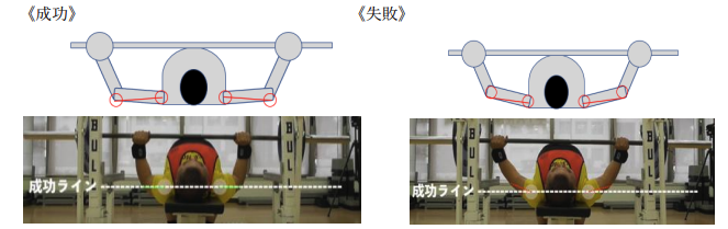 静止が不十分だとプレスの合図が出ません。胸まで降ろしたらバーをしっかり静止することを意識しましょう。